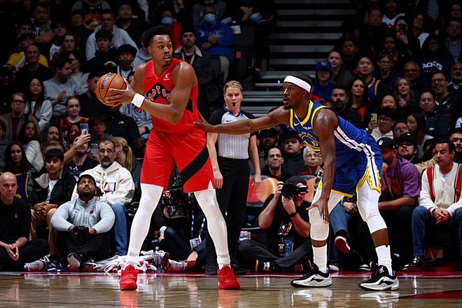 本场比赛中,客串担任先发中锋的猛龙锋线新星斯科蒂-巴恩斯(Scottie Barnes)打出了一场现象级的比赛,简直是打爆了勇士的内线。巴恩斯全场出场42分26秒,投篮17中11,三分线外1中0,罚球1中1,得到了23分25篮板10助攻3抢断1盖帽的三双数据,其中还包括了惊人的9个前场篮板,还有3次失误和4次犯规,正负值也是达到了+24。巴恩斯在进攻端势不可挡,他拿下了大量的前场篮板,展现出来超强的篮下得分能力,勇士内线根本没有办法对他进行基本的限制。巴恩斯还展现出了出色的传球能力和策应能力,同样在这方面起到了关键的作用。巴恩斯在防守端的表现同样是可圈可点的,同样发挥出了自己全方位的防守能力。总体来看,巴恩斯在本场比赛中展现出了极其出色的个人能力,简直是打出了顶级内线球星的水准。